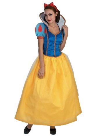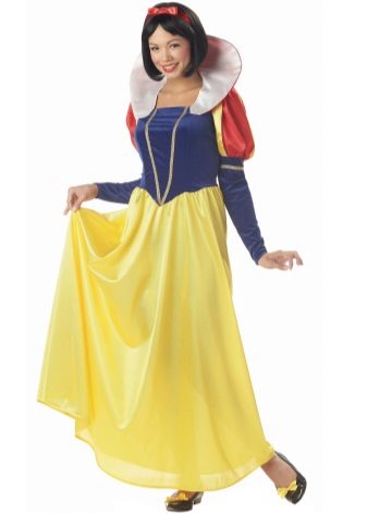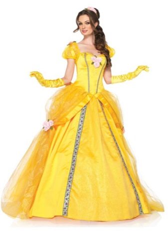 Speaking of Disney's princesses, one can not forget about Snow White, whose robe is a fluffy dress to the floor, the top of which is made in a blue shade, and the bottom is a beautiful lemon color. Sleeves lanterns give volume to the shoulders, and the red ribbon in the hair is the final detail of the attire.