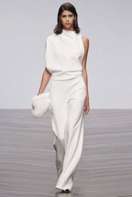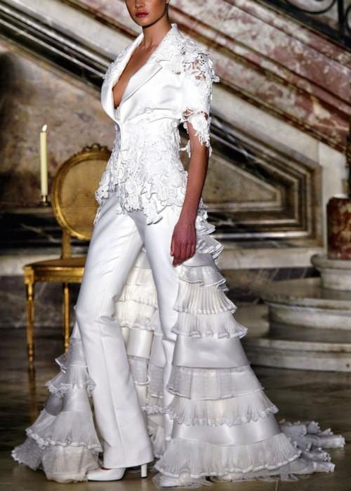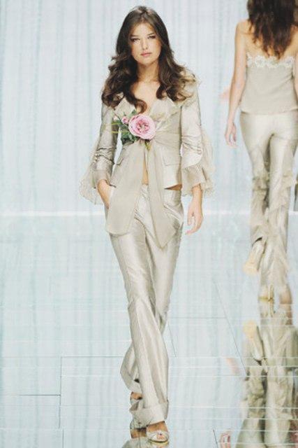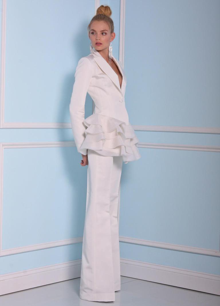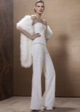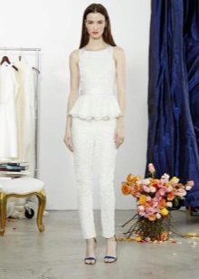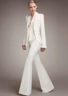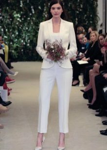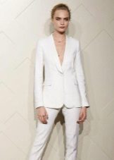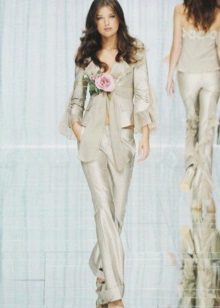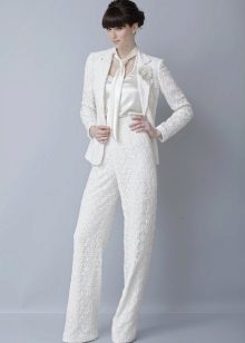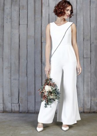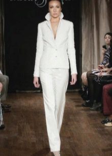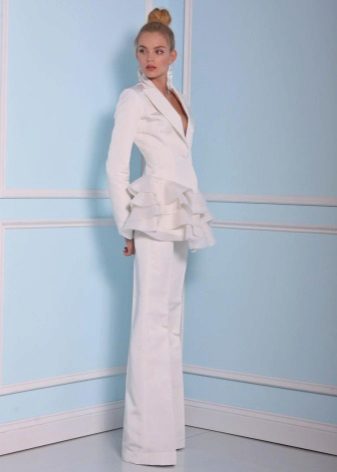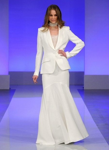 A wedding suit may consist of two or three elements. In this case, a vest is added to the jacket and trousers or skirt. If the bride prefers to classics more original youth options, then she can recommend asymmetrical models of jackets, jackets and tuxedos, which are very relevant this season, trousers of unusual shape.
