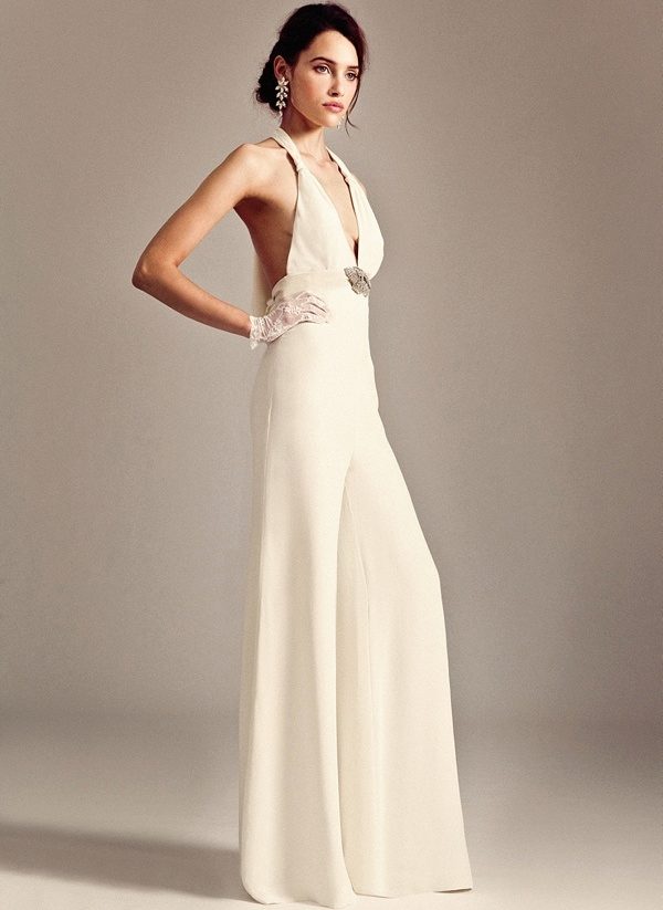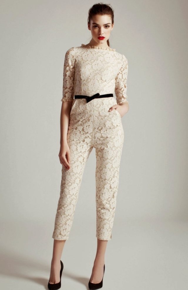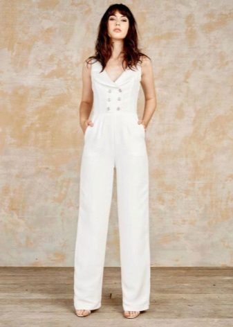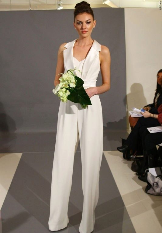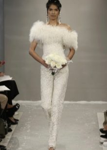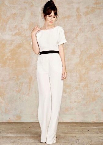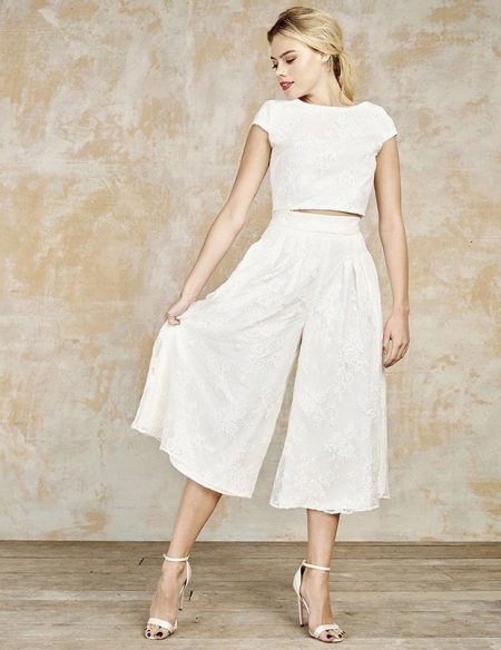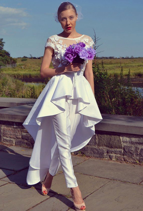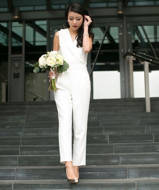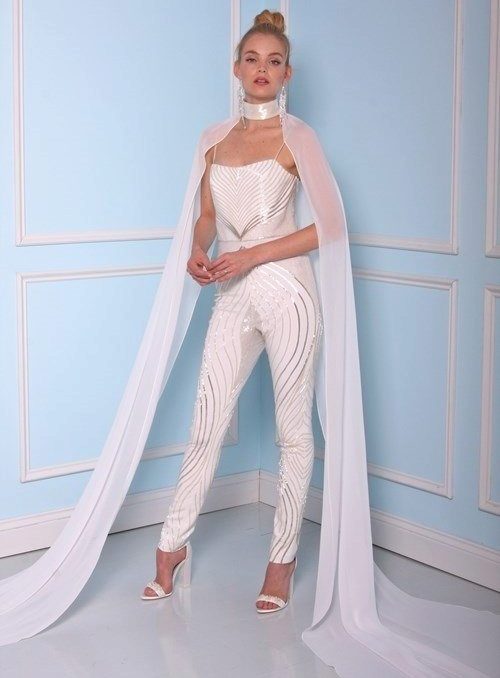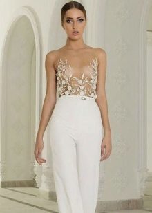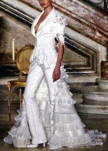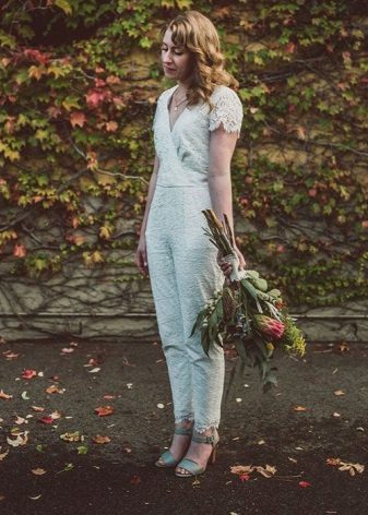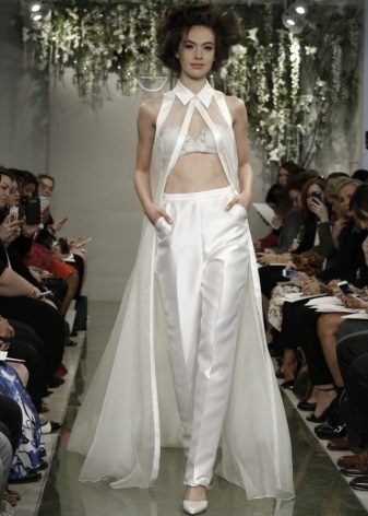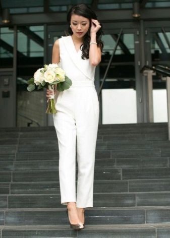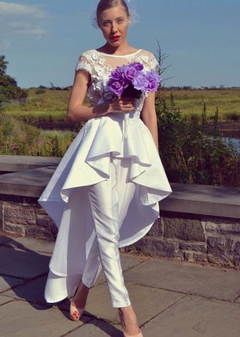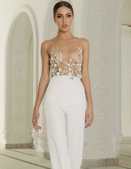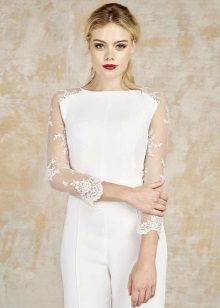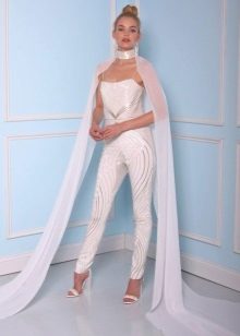 Another interesting option is a jumpsuit. This outfit always looks very unusual and extravagant. And as an element of a wedding dress, especially. Overalls can have a strict cut on the front and a deep cut on the back. As accessories can be used long gloves or a wide belt, emphasizing a thin waist. A cropped jacket will add to the completeness of the wedding dress.