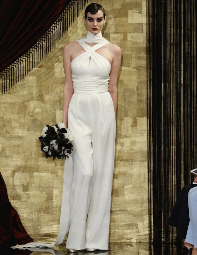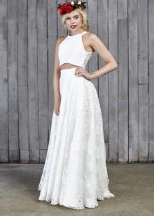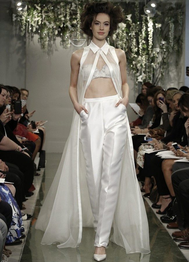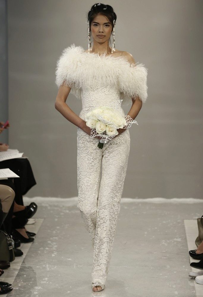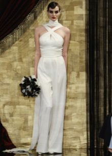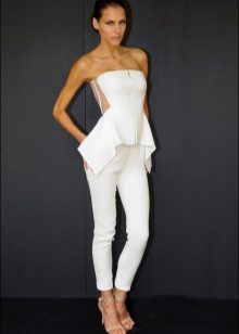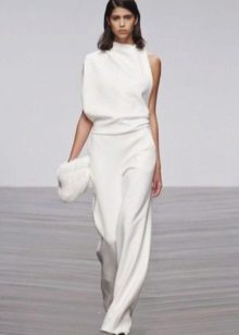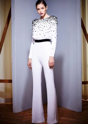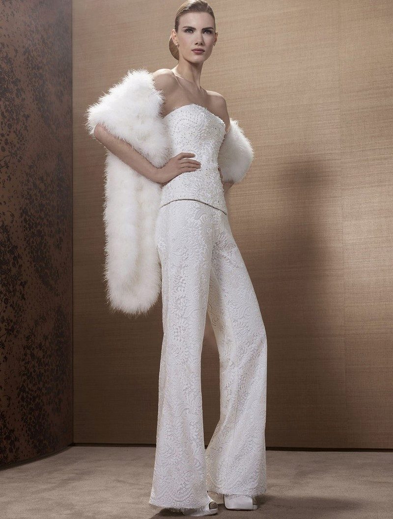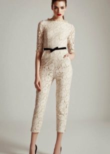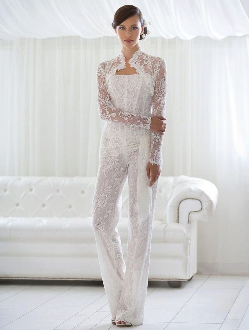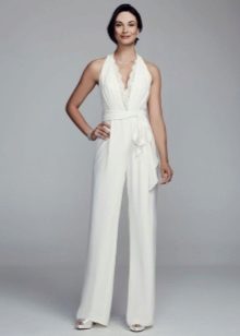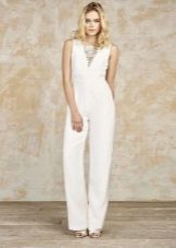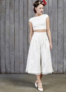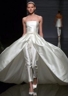 Another interesting option is a jumpsuit. This outfit always looks very unusual and extravagant. And as an element of a wedding dress, especially. Overalls can have a strict cut on the front and a deep cut on the back. As accessories can be used long gloves or a wide belt, emphasizing a thin waist. A cropped jacket will add to the completeness of the wedding dress.
