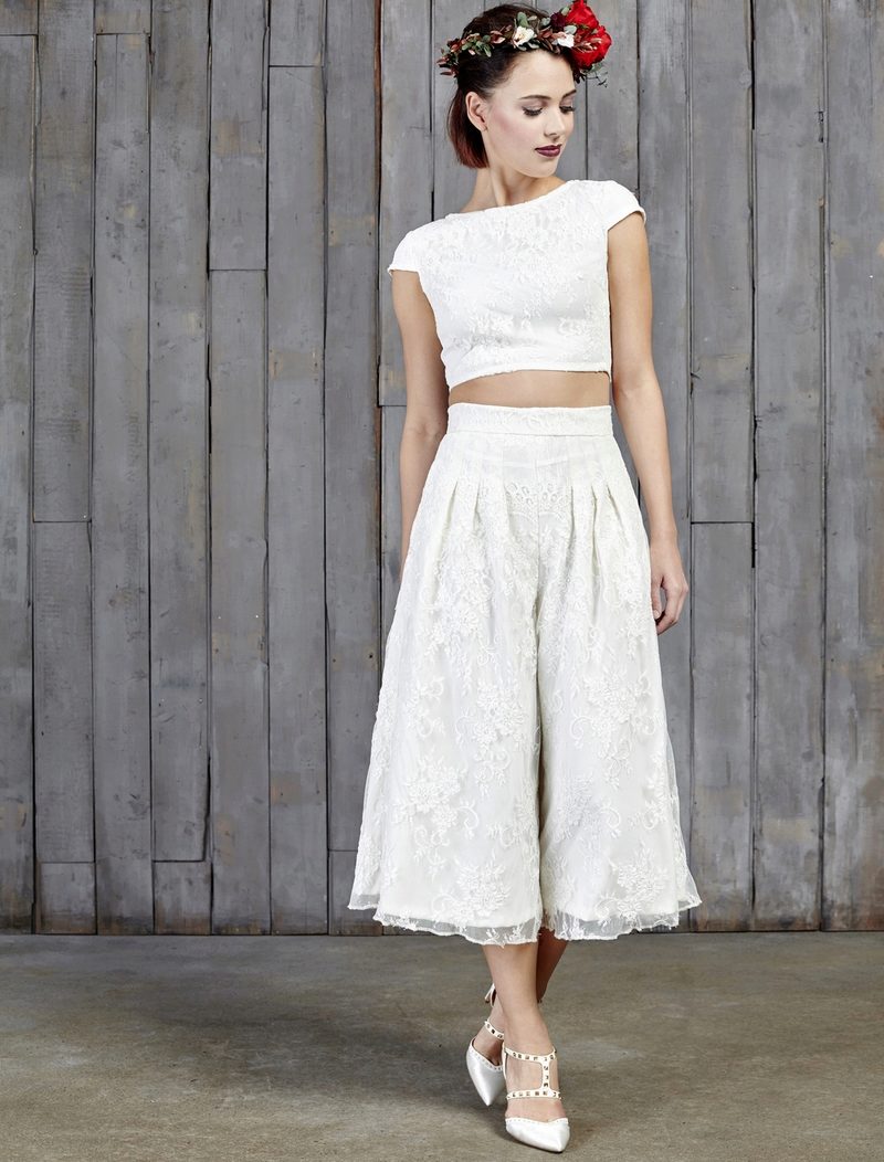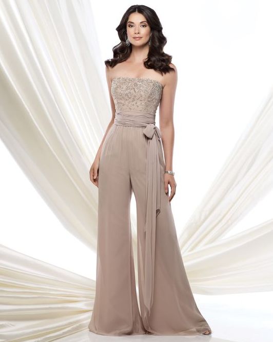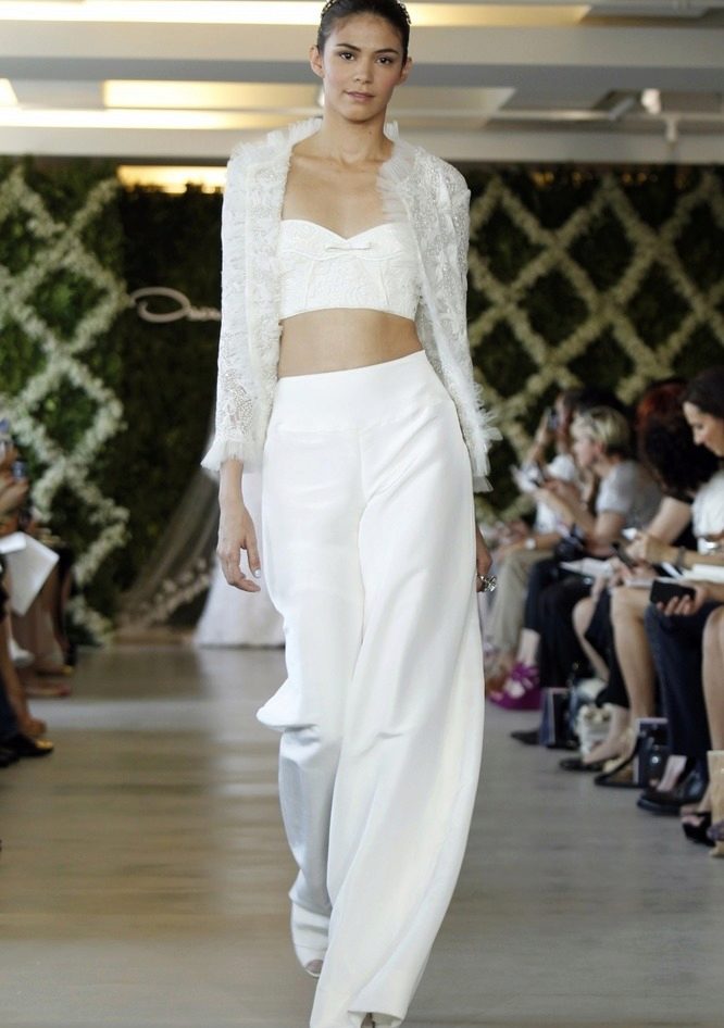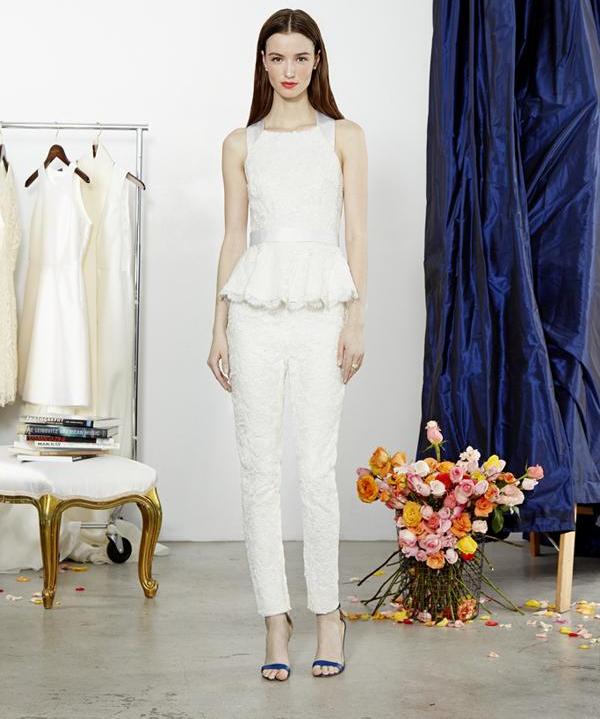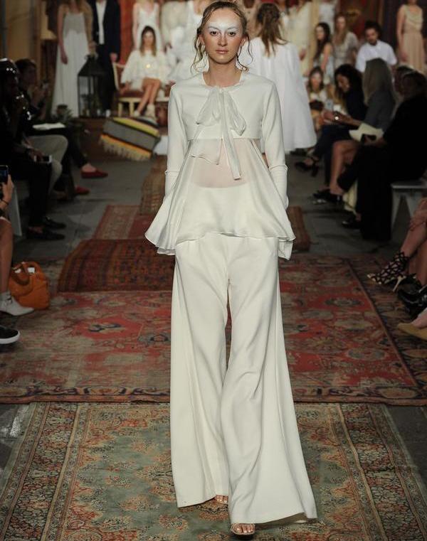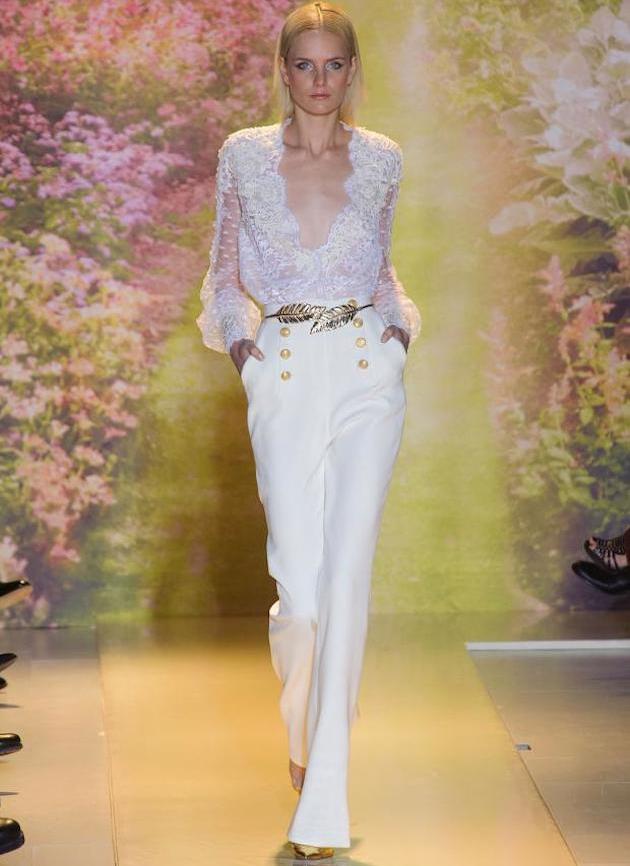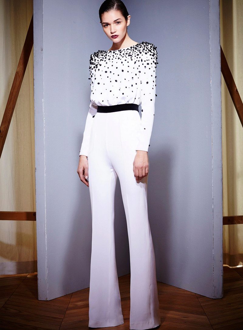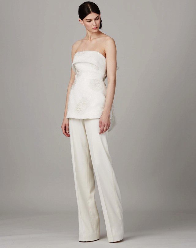 Another interesting option is a jumpsuit. This outfit always looks very unusual and extravagant. And as an element of a wedding dress, especially. Overalls can have a strict cut on the front and a deep cut on the back. As accessories can be used long gloves or a wide belt, emphasizing a thin waist. A cropped jacket will add to the completeness of the wedding dress.