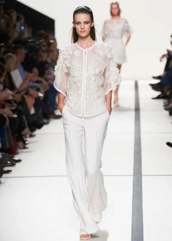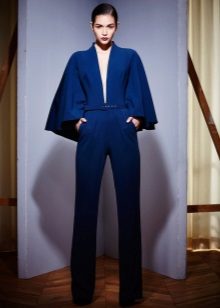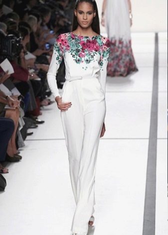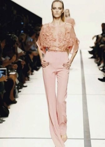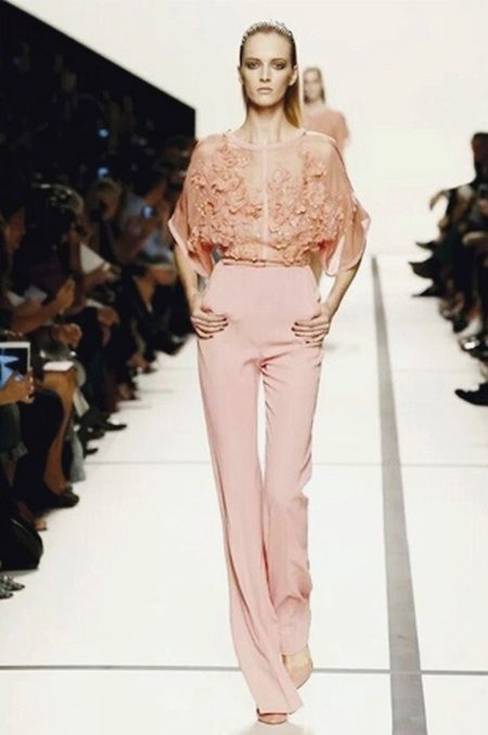 Variations on the classic trouser suit. A jacket with a collar-resistant original style, a model with a train, flared trousers in combination with a transparent top of the same color - all these outfits look stylish and noble, thanks to clear lines, a strict silhouette, lack of ornaments and excessive decor.