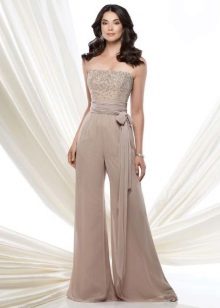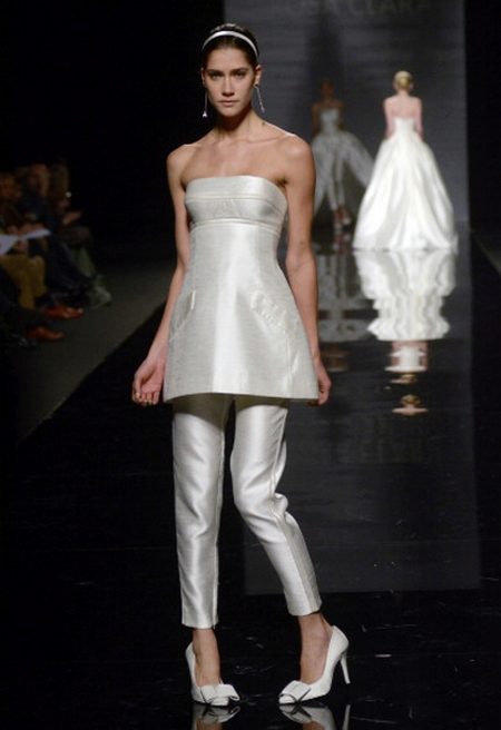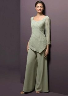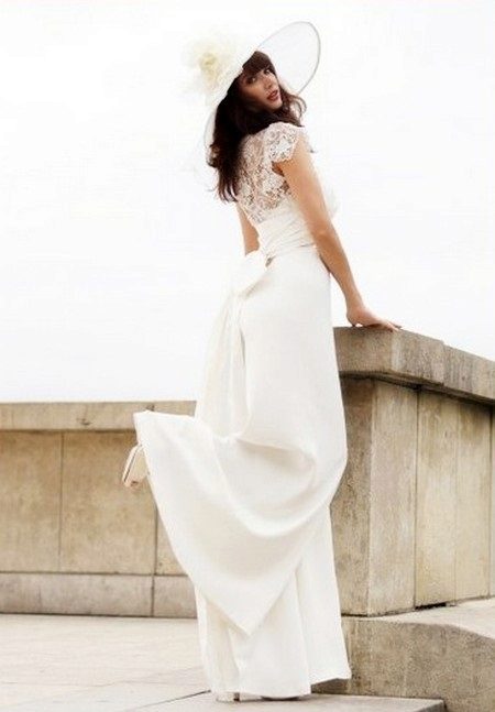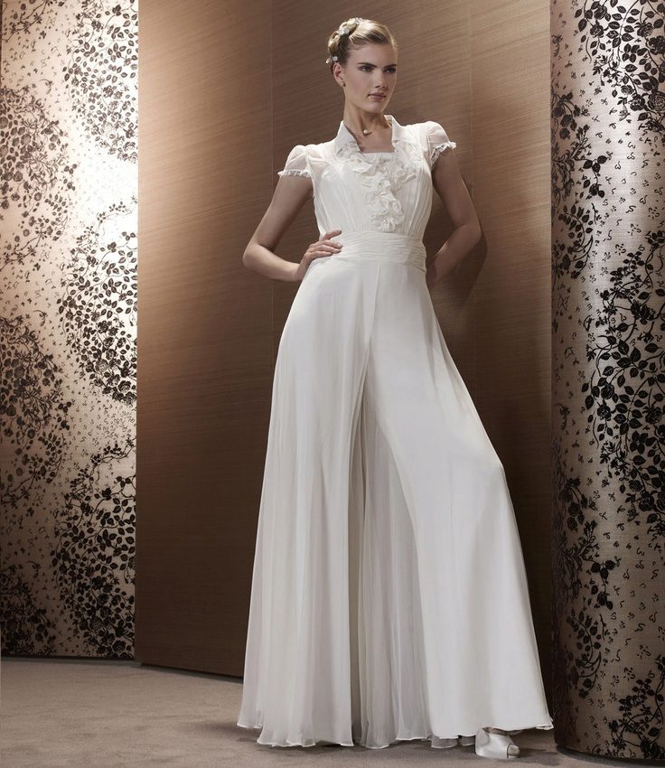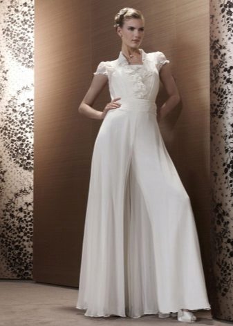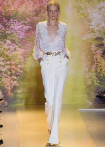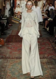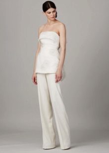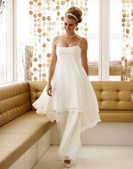 For brides in an interesting position, entire collections of stylish and beautiful suits for a wedding celebration have been developed. Very elegant, and most importantly, comfortable for the future mother costume, consists of trousers and a magnificent tunic. Tunic should not be tight, looks good light, free style. Tunic can have different lengths (mid-thigh and lower, straight or asymmetrical cut).