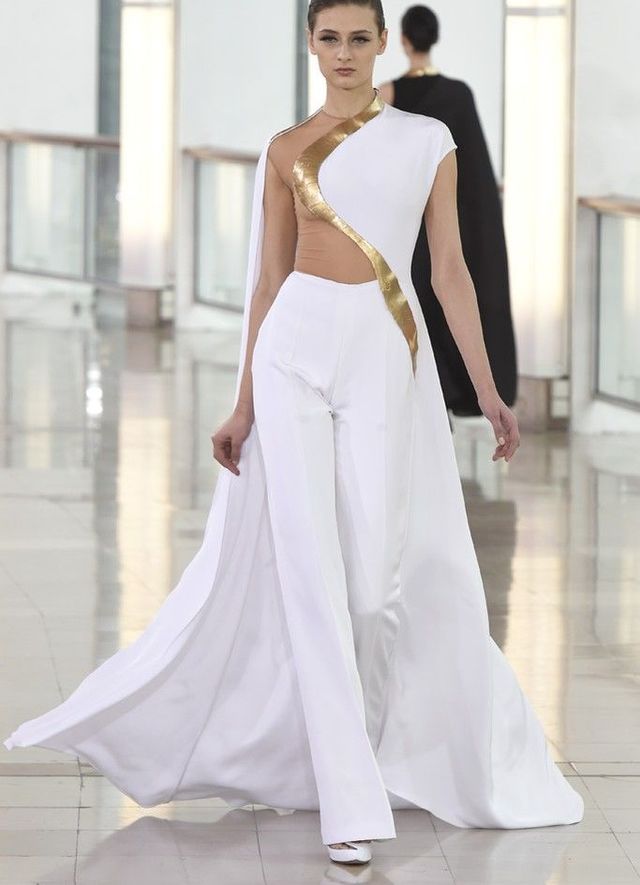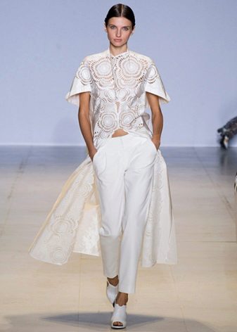 Pants can have a classic or original design, for example, be supplemented with loops of different lengths and density. A jacket can also have a strict silhouette or be supplemented with ruffles, folds, frills, basques, a train, etc.