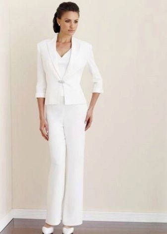 Decor and decoration. The bridal outfit should be elegant and feminine. Therefore, the abundance of decorative ornaments should not be. In addition, everything also depends on the style of the suit itself. If the jacket is decorated with lush ruffles, frills, train, other decorative elements, then additional accessories and decorations should be minimal (exquisite brooch, pendant, tiara, elegant embroidery with rhinestones or pearls, etc.).