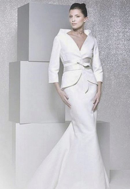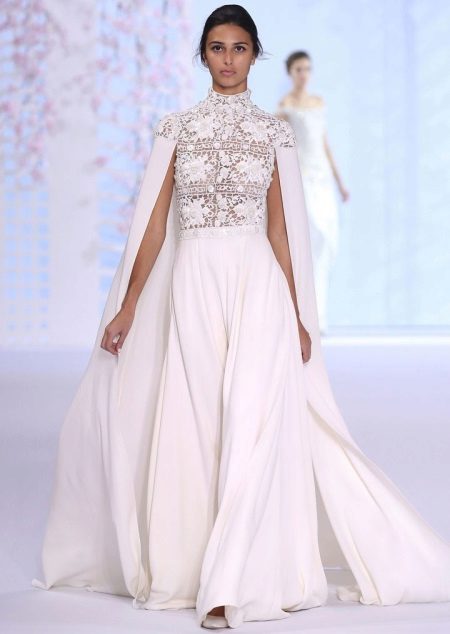 Lovers of extravagant and bold images may consider the option with a jacket the length of the floor. Very unusual and stylish interpretation of the wedding dress.