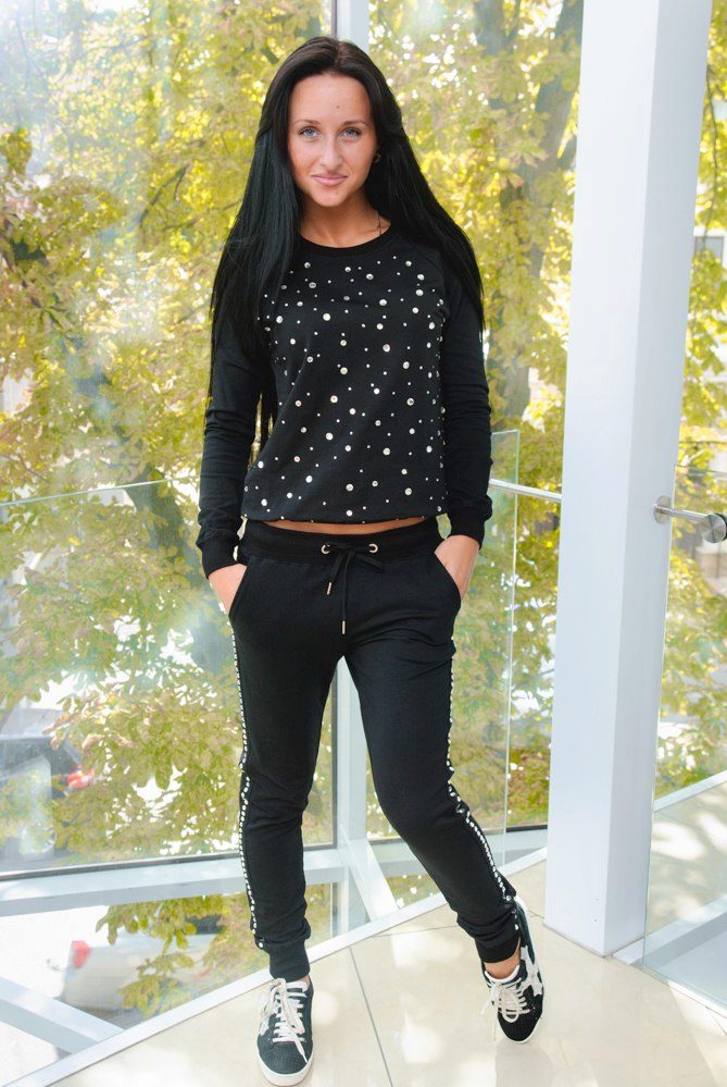 For tailoring of sports suits exclusively natural fabrics are used, such as cotton, wool and knitwear. To make the products elastic, the material will include a small amount of synthetic fibers, for example, elastane or lycra, so that they do not hinder movement, but also retain their original shape. The original decision was the combination of cotton fabric with lace that adorns the front of the jacket and side seams of the pants.