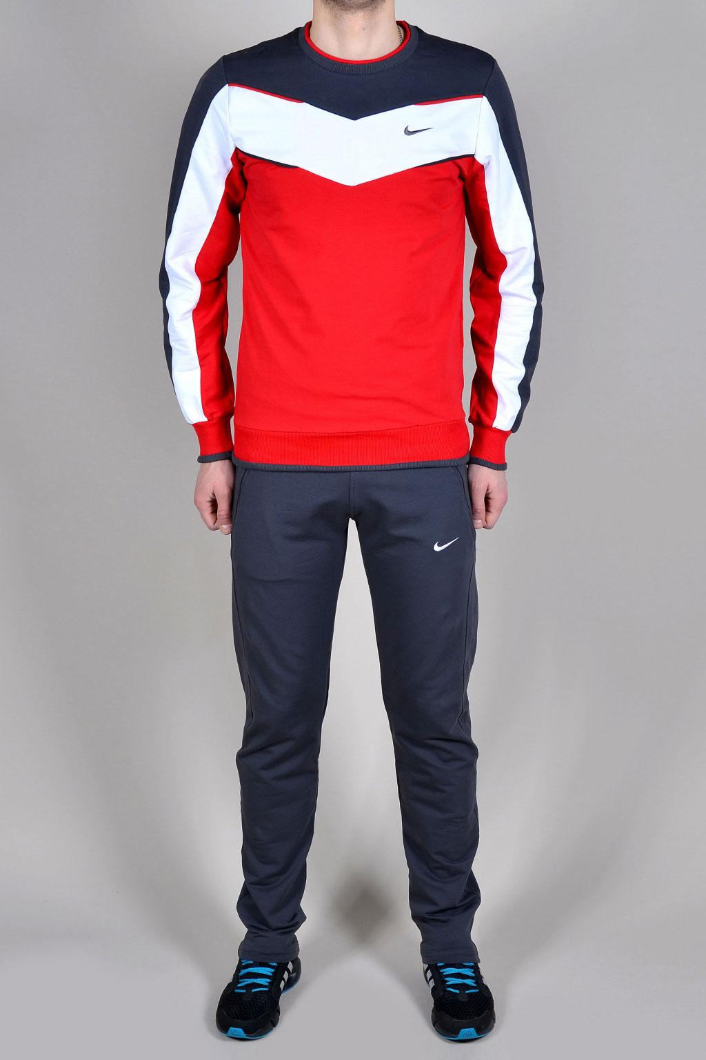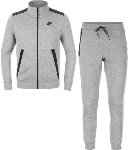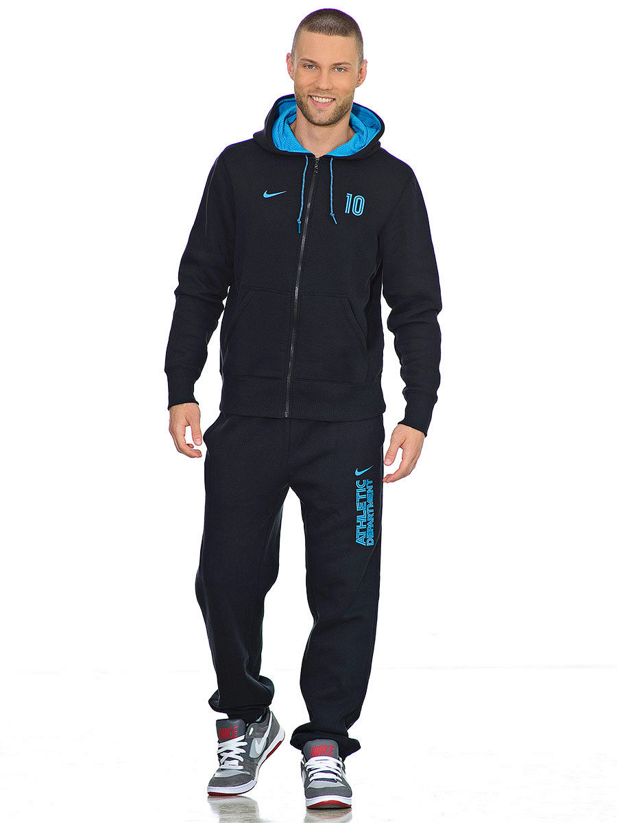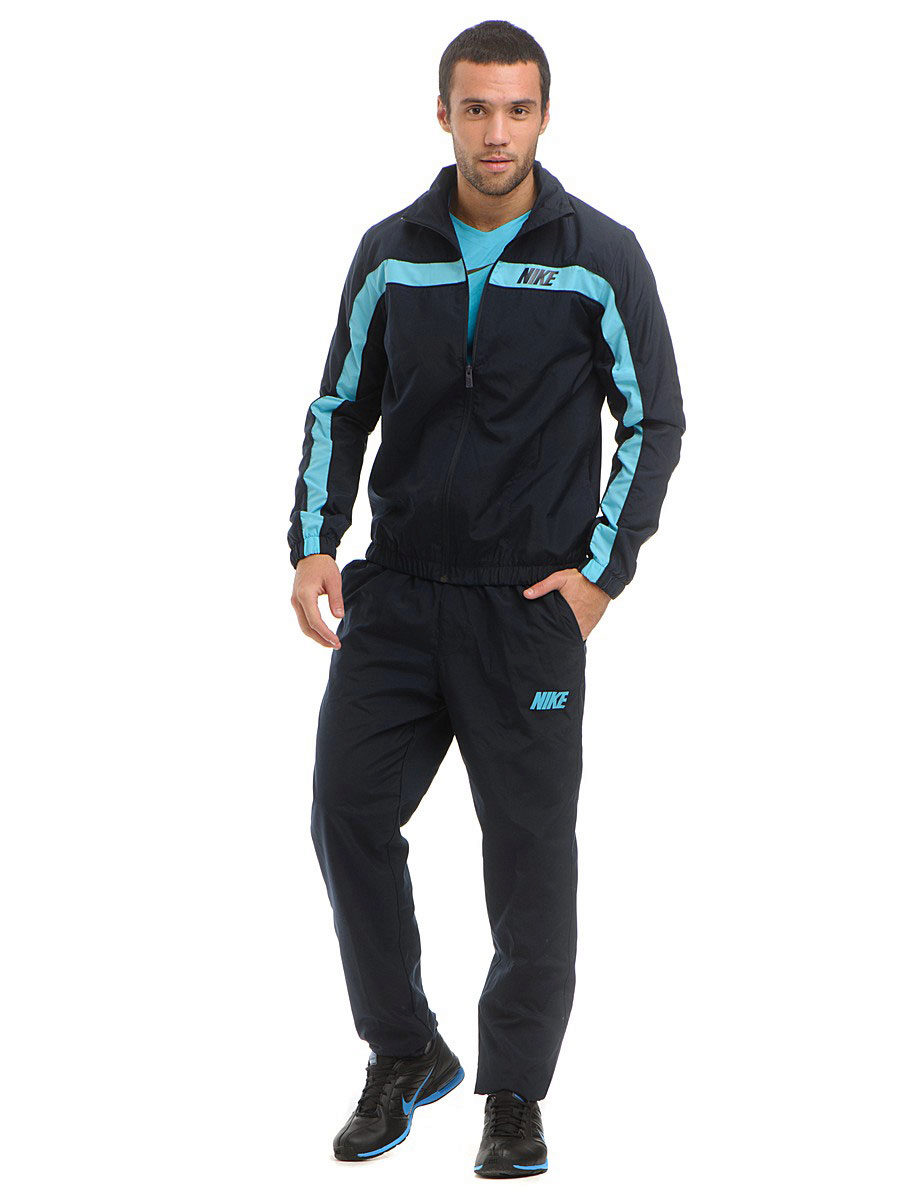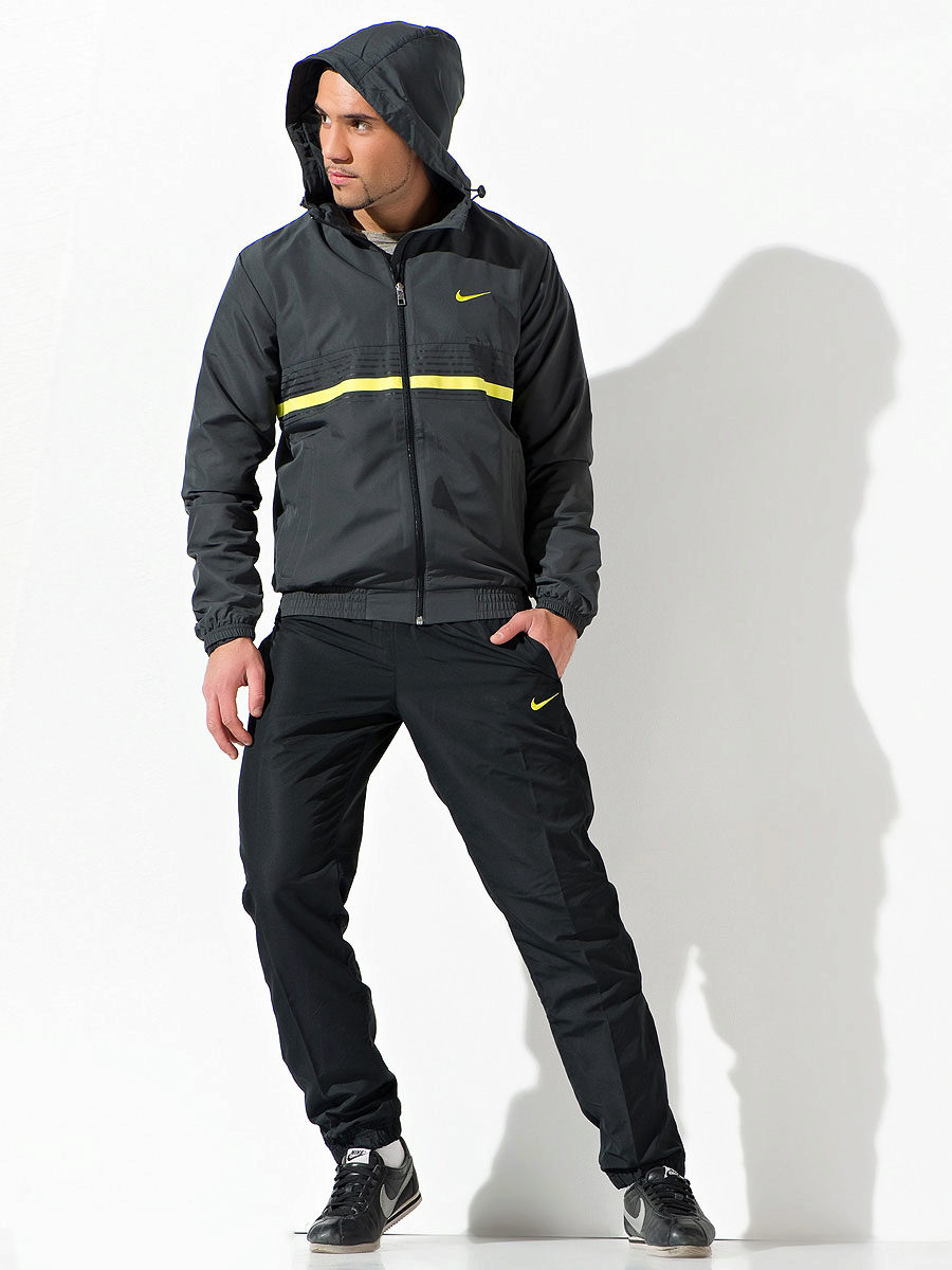 Men's line of sportswear in terms of color has a mostly classic focus. These are suits of various shades of gray, blue, and also invariable black and white. Combinations of the indicated colors, and also gray-green, claret-blue combinations harmoniously look. In addition, there are original models: for example, light gray background of the costume is decorated with fragments with a “cell” print in blue tones.Recall that on each model invariably present Nike brand logo.