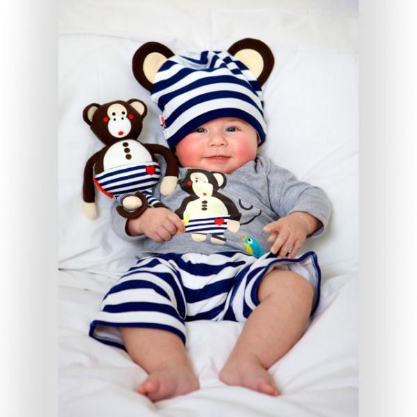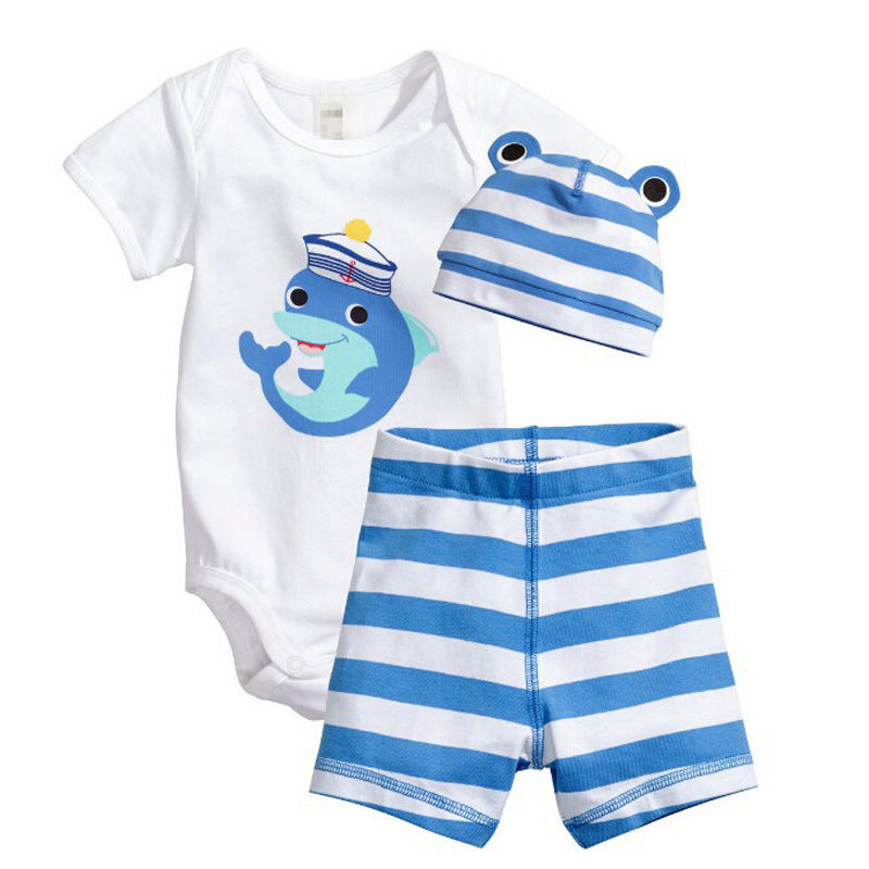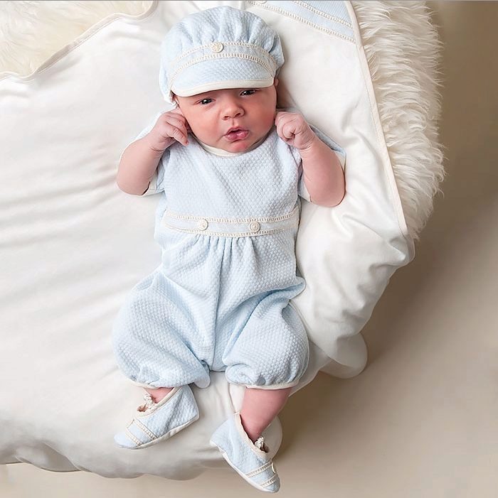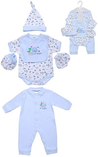 The kit for the boy contains bodysuit, shorts, sliders, a shirt and a cap.