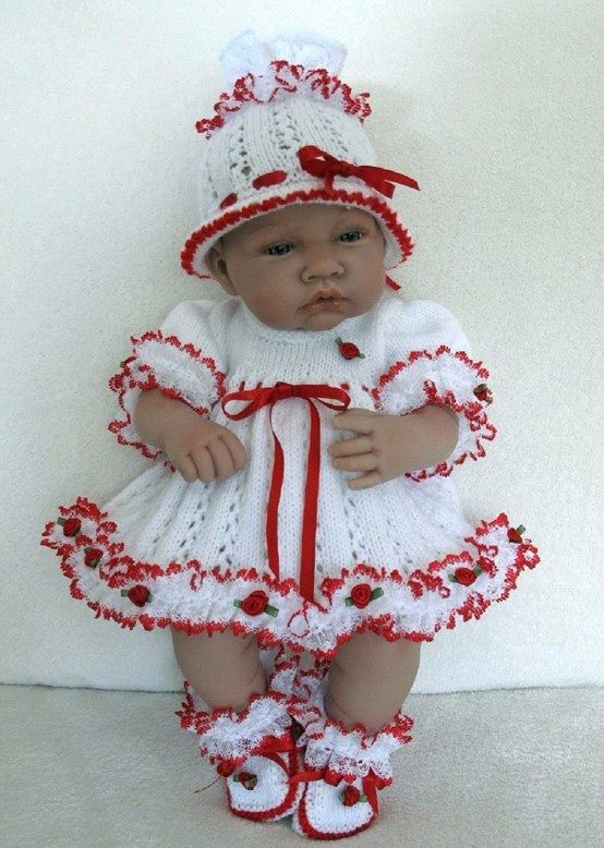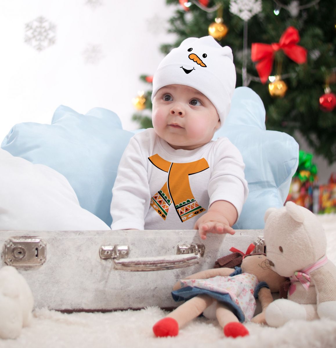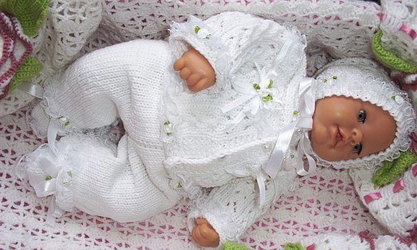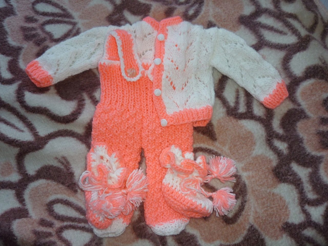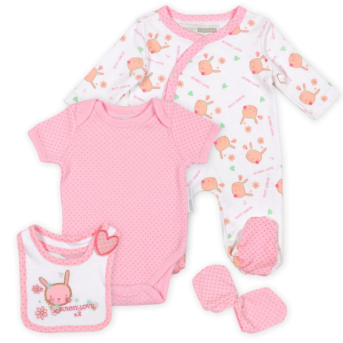 Suit for newborns includes a vest and romper, bodysuit, blouse and cap, as well as a bib, scratches and booties or socks.