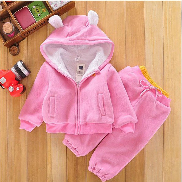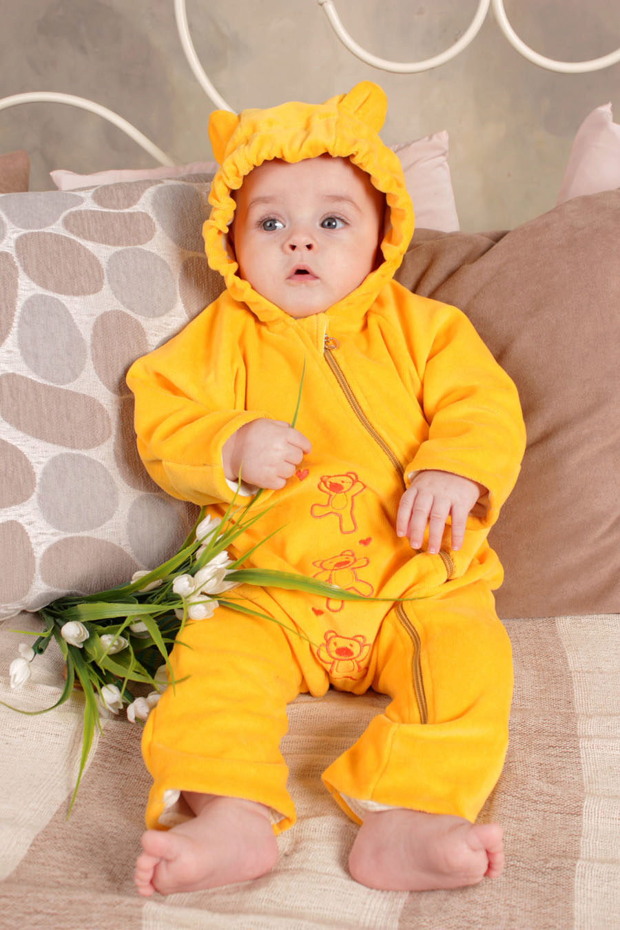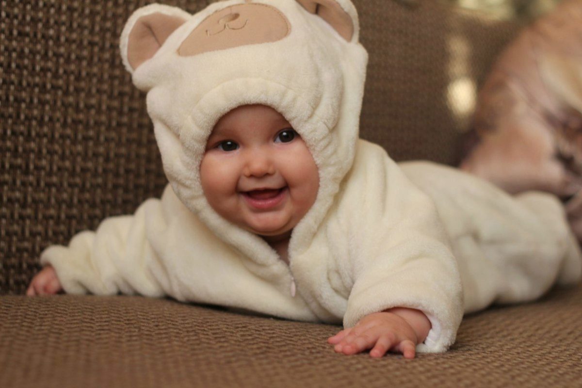 Many parents prefer cool outfits for their kids. For example, this is a jacket with a hood with ears like an animal. It can be a teddy bear, a bunny or a cat. In this image, the baby looks very cute and funny.
