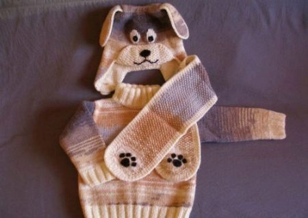 Very popular models with attractive faces of animals. So, in the photo you can see an interesting option. This is a doggy costume. It consists of two caps, inside and outside, with a dog muzzle and ears, as well as a jumper and scarf.