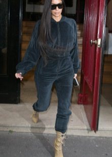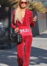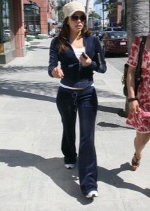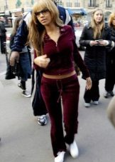 If a velor suit is part of a sports wardrobe, then as a supplement can be used a T-shirt, top, T-shirt and sports shoes (gym shoes or sneakers). Cap will complement the bright sporty image.