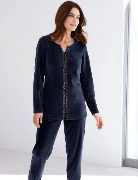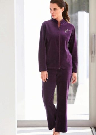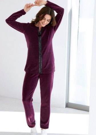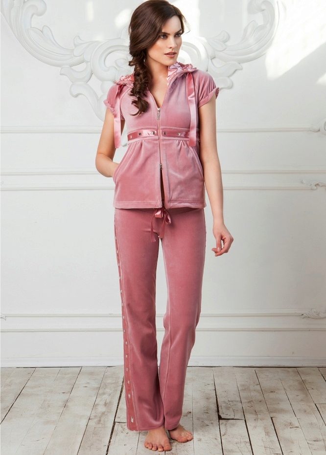 Velor suit - part of the home wardrobe. Such a model is especially convenient and comfortable in the cold season. Velor is very soft and pleasant to the touch, plush surface gives the skin a feeling of tenderness and warmth. Such a suit, even at home, looks very unusual and elegant. Especially if the model is complemented by beautiful decor.