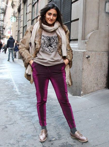 The suit should not be too tight on the body, slightly flared flowing trousers and straight cut jacket of dark blue, wine, green, violet and other colors look much more effective.