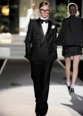 Initially it was a men's jacket for a smoking room. It was sewn from velvet or velvet, which absorbed the smoke of cigars, and lapels from sliding satin were necessary to make it convenient to shake off the ashes. Such tuxedos came to the women's wardrobe, but now such a cut is more a tribute to traditions than a necessity.
