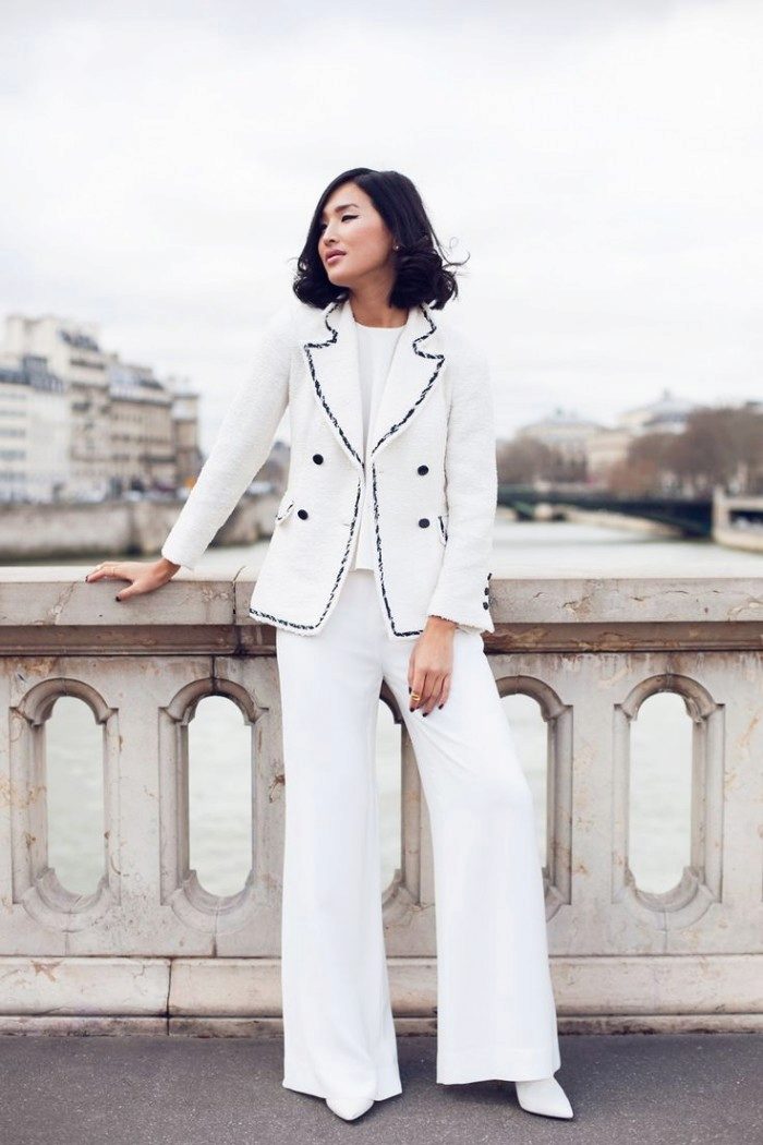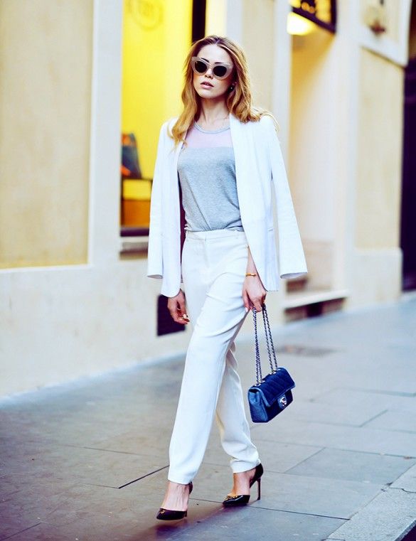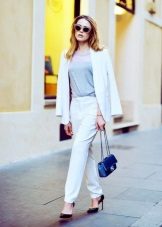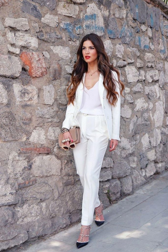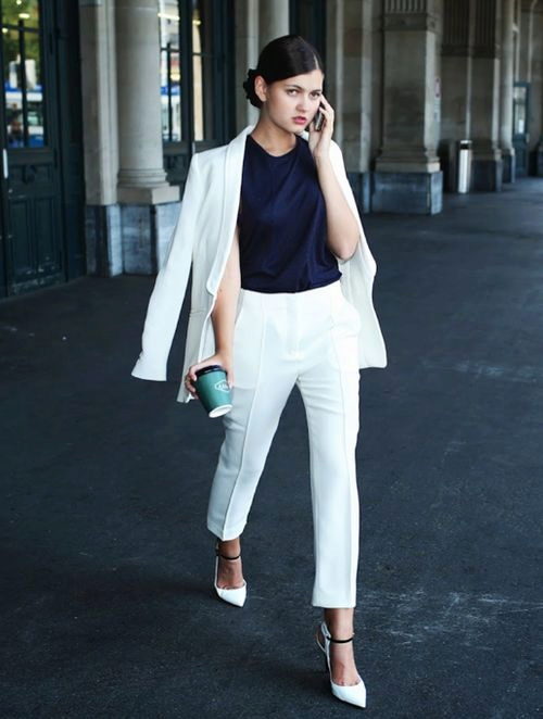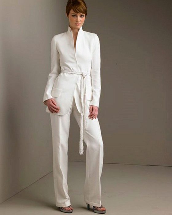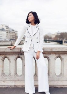 - A snow-white suit consisting of a fitted jacket and a narrow pencil skirt will be suitable for publication. Ankle boots or high-heeled pumps will complete the look. The costume itself is so good that it does not require additional accessories.