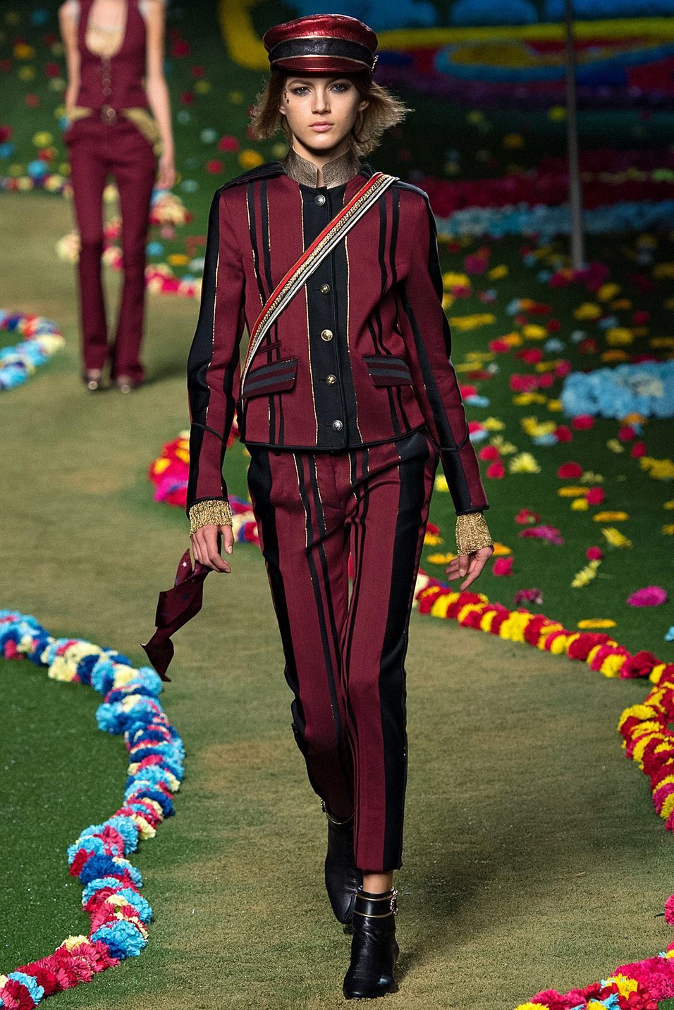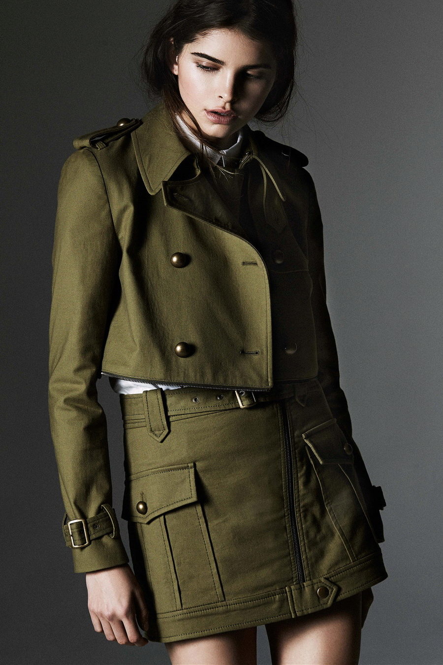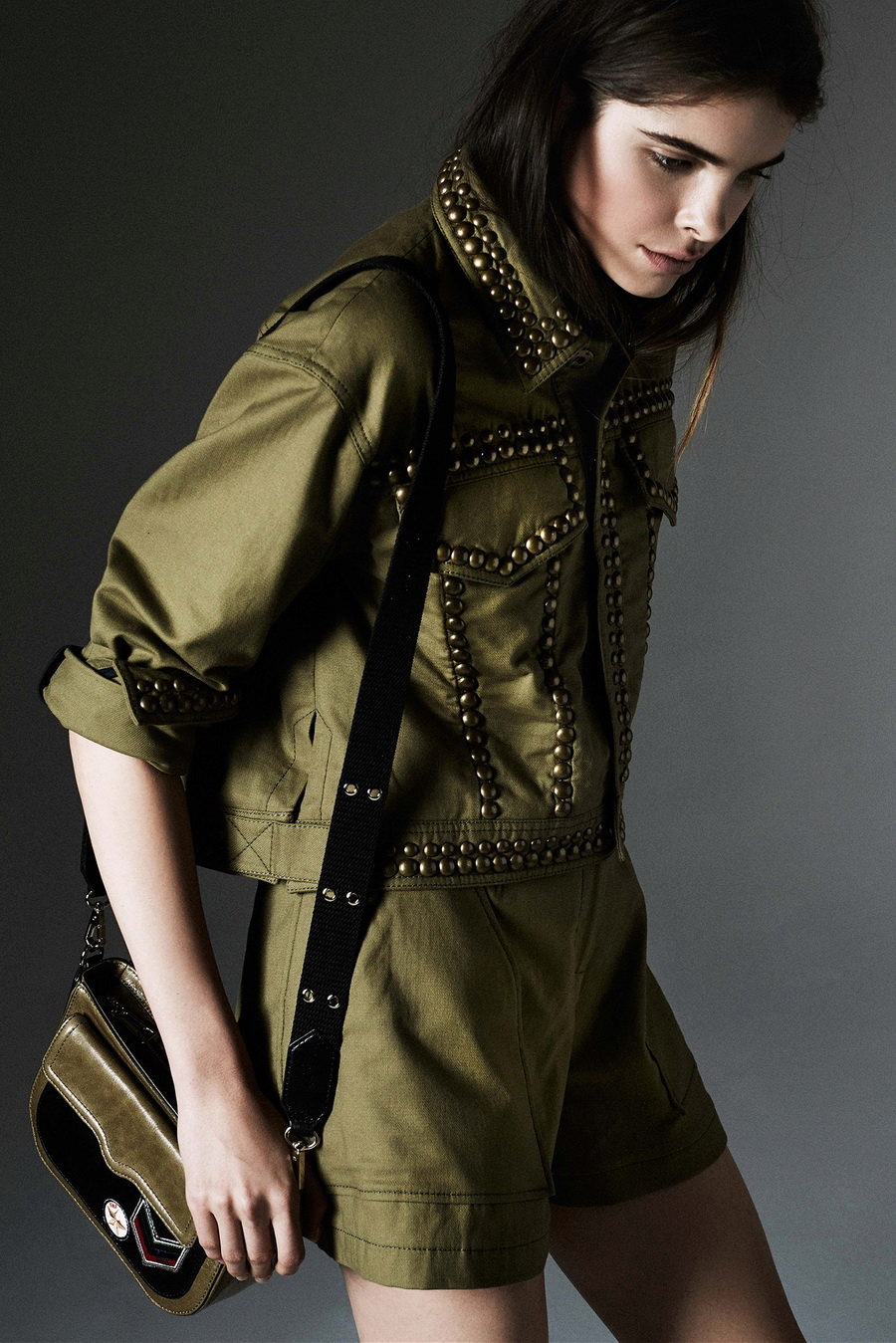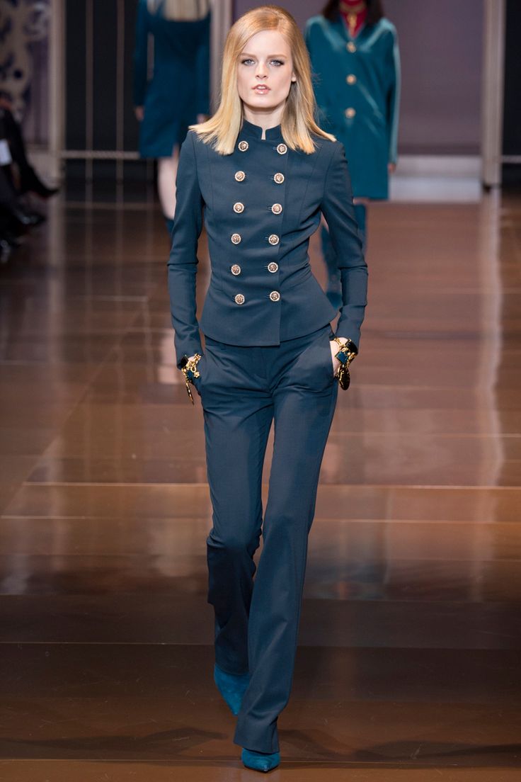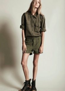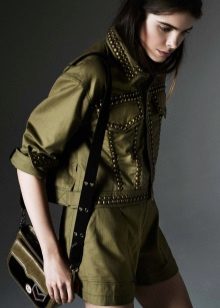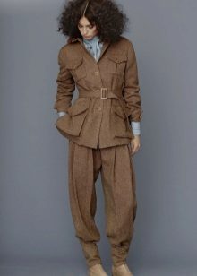 A military style suit should be styled as a military uniform. It can be stripes, metal buttons, epaulets, lacing and other paraphernalia. There are always many pockets of different size on clothes, especially trousers. The color scale is marsh-brown, you can often find clothes with camouflage colors.