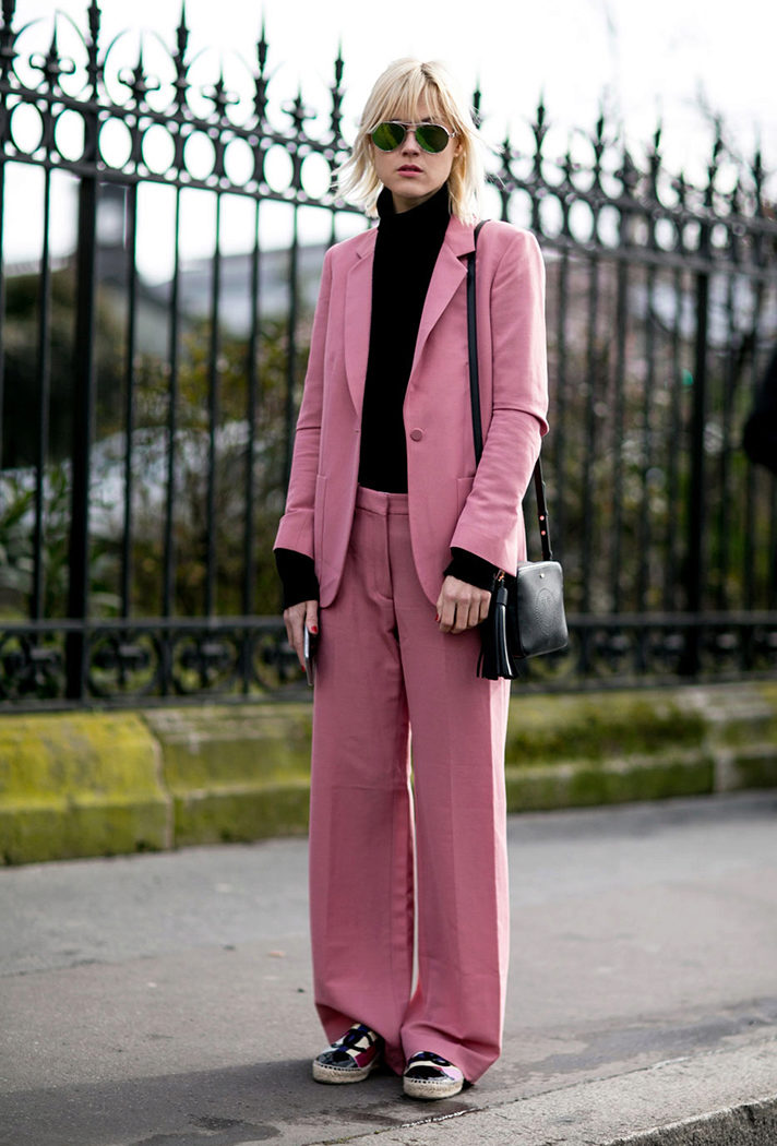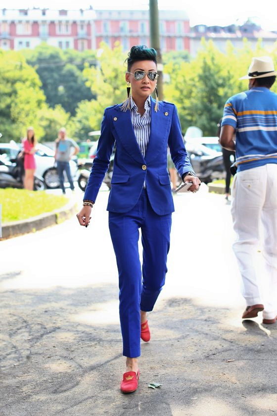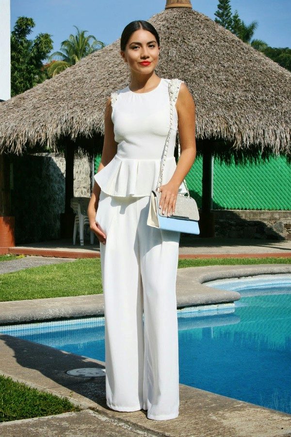 For an evening out, you can choose an elegant black or solemn white suit chic style.