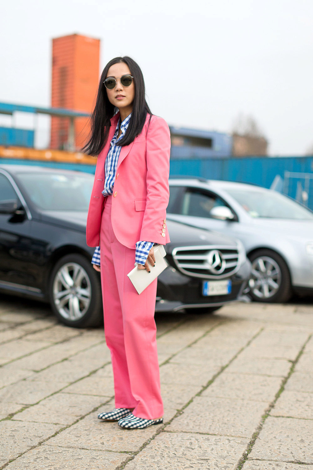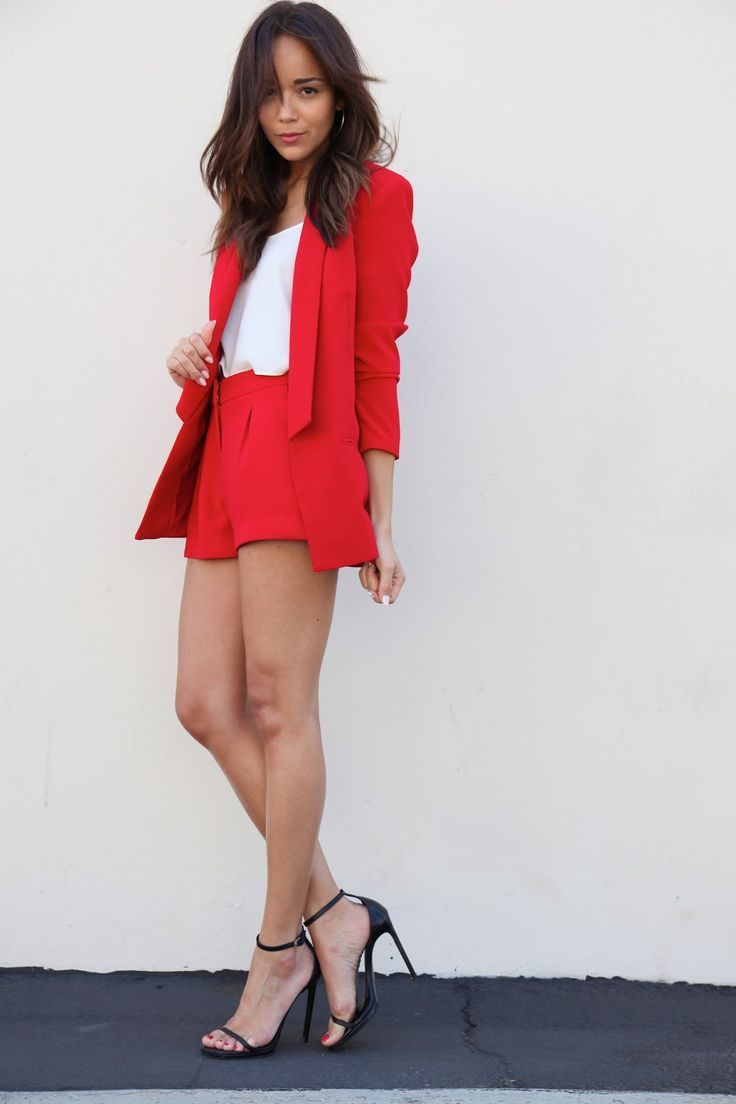 - Casual summer style in street style. White Crop Top, coral-colored suit, consisting of short shorts and an extended blazer, black closed sandals with thick heels. Look complemented by a black clutch and mirrored sunglasses. This outlet is suitable for walking around the city, meeting friends and a fashionable party.