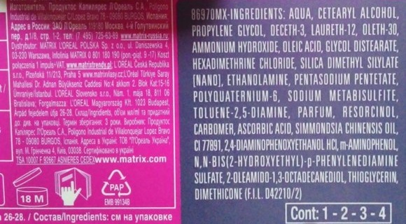 The manufacturer retains the unique formula of Matrix paints in secret, and the package contains only information about the main components of the composition.