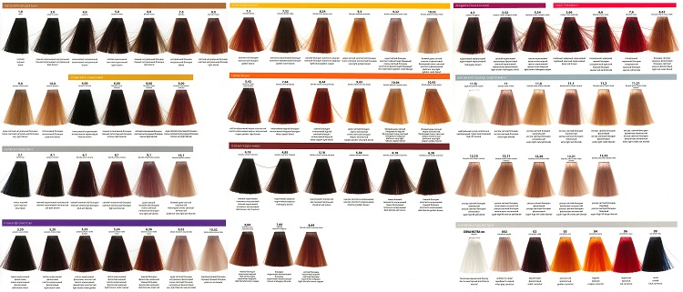 The professional palette includes a huge number of colors for blondes, brown-haired, red and brunette. For the convenience of working with the palette, the manufacturer has developed a system of alphanumeric designations of shades: