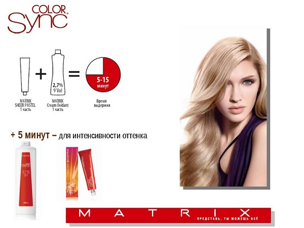 - The impressive durability and high quality of the “Color Sync” blonds, brighten the hair, but are not washed out for several months. After tinting 4-5 shades darker, they look alive and beautifully shine.