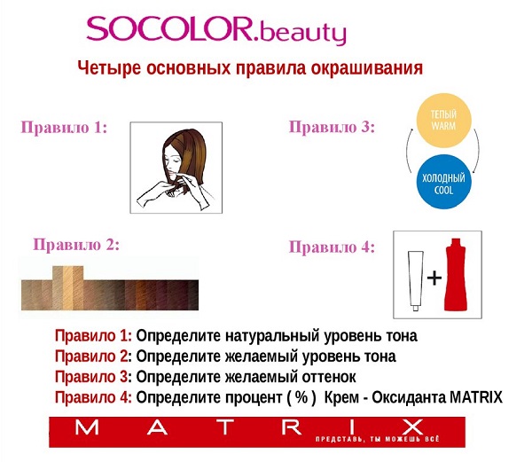 Although Matrix products are intended for professional painting in beauty salons, they are also used for self-coloring at home. To get the desired result at home, it is necessary to thoroughly read the instructions, paying particular attention to the paragraph on contraindications to the use of resistant dyes with ammonia.