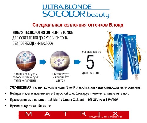 - Composition with innovative technology Out-Lift Blonde, which is able to neutralize and lighten hair in one application, block unwanted tones with an admixture of red or yellow pigment and simulate clean, radiant, cool shades of blond;