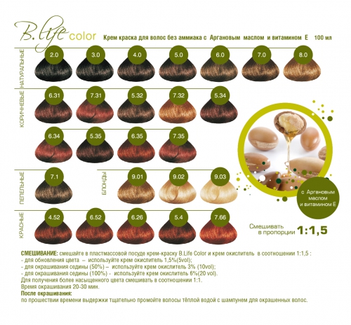 Oils provide hair support and protection from the negative effects of paint in the process of its application and aging. Dye pigments are easily introduced into the hair structure. Brightness of color is demonstrated on the hair for a long time after dyeing. The palette has a choice of 101 deep shades.