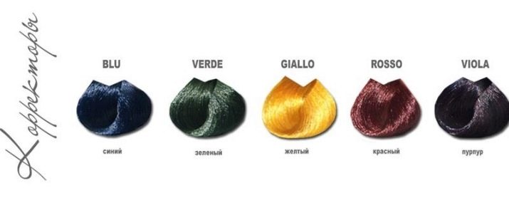Shades to mute or highlight unsuccessful colors, masking inappropriate to the face of redhead or inappropriate shade, unexpectedly manifested as a result of staining. The corrective scale is represented by the FarmaVita brand in blue, green, red, yellow and violet colors.