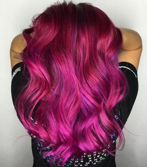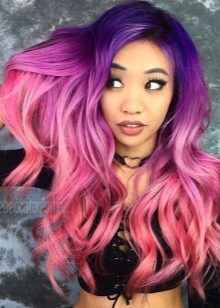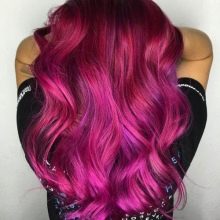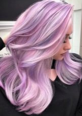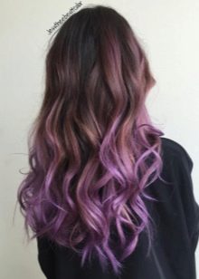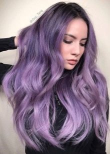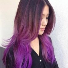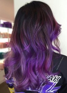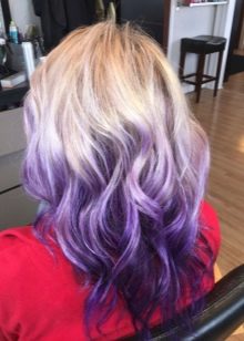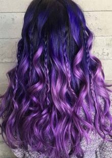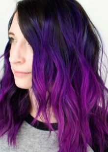 Balayazh is considered one of the most popular types of coloring according to the reviews of girls, left in the World Wide Web in posts devoted to hair coloring in purple. For this coloring valuable long curls length. In this case, the color is woven into the main and strengthened downwards. When coloring using two or three shades. In this case, staining is performed by strands, selecting colors based on their compatibility.