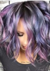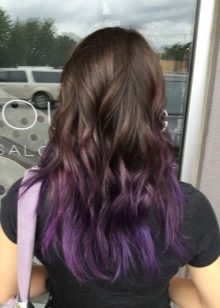 Ombre implies a smooth transition of related tones. The paint in this case can be bright violet, and at the end - ashy violet. However, if desired, you can bring to the purple and the base color. When highlighting, individual strands are lightened, which later become the basis for paint. Pigment is applied on them and kept for the right time, then washed off with warm water. This is a great option for owners of dark hair.