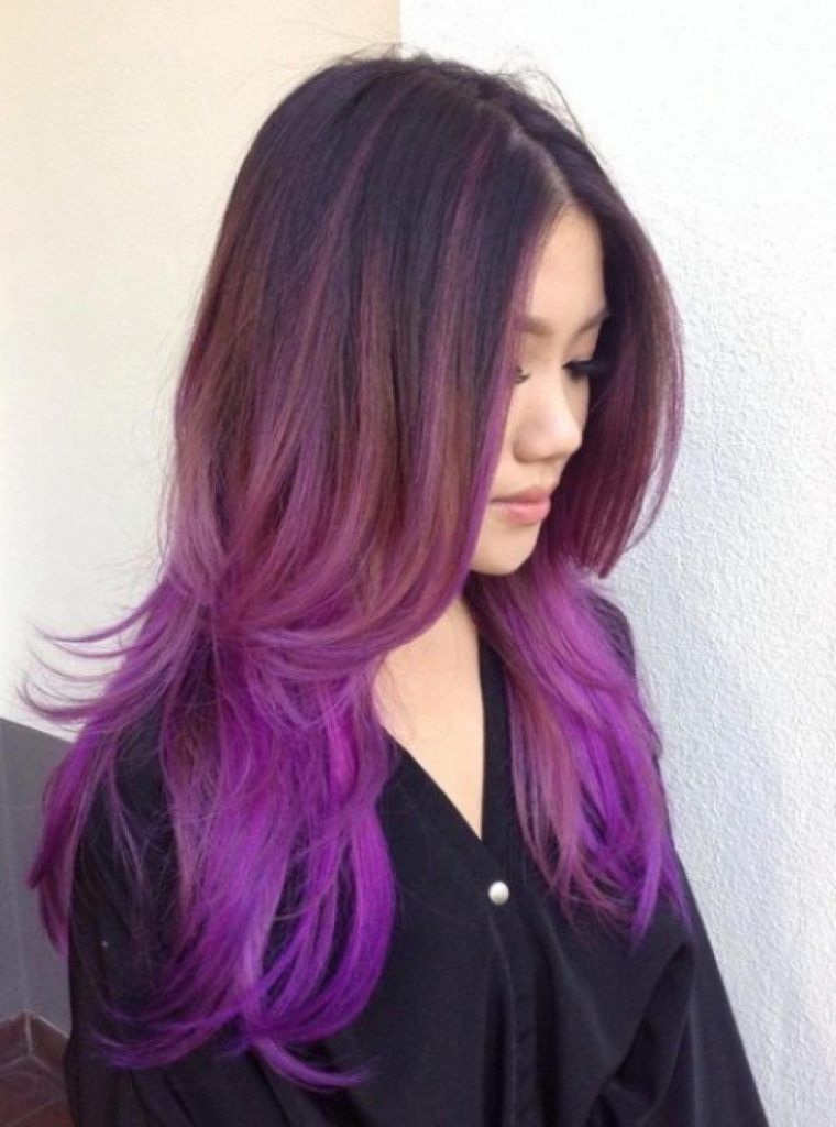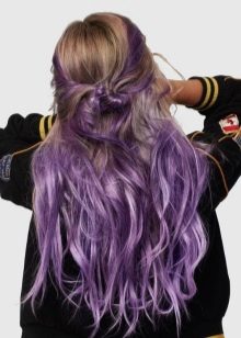 Such coloring can be carried out by different technologies. For example, it can be coloring, highlighting, ombre or balayazh. Each technique is suitable for different hair. For example, a partial dyeing for dark or brown hair will look better if you make a contrast transition from the base color to the purple. In this case, the strands are collected with rubber bands, the ends are first lightened, and then dyed purple.