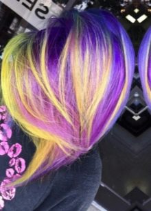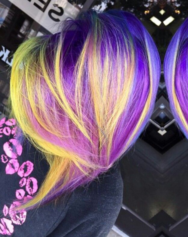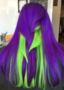 The combination of purple with green and yellow looks beautiful only on young girls. In adolescence, brightness is important, which can be created by mixing different tones. Sometimes a fourth color is added to the palette. Such contrasts are used mainly by beauty bloggers or teenagers. It is difficult to call such staining feminine: rather, it is a way of introducing epatage into the set.