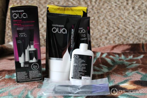 - Pleasant aroma. Garnier Olia paint differs from other coloring agents in that it does not contain a strong ammonia odor. When you open the tube you can catch a pleasant floral and fruity smell, because the mixture includes compositions from apple, jasmine, wild rose and pear.