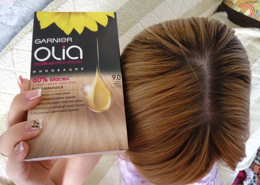Specialists of the company Garnier created the paint Olia, which does not contain ammonia, its role is assumed by the oil. It can be noted that this is the first tool created in this way. Not surprisingly, most reviews of this dyeing agent are mostly positive. Hair after applying Olia paint does not dry out and does not fall out.