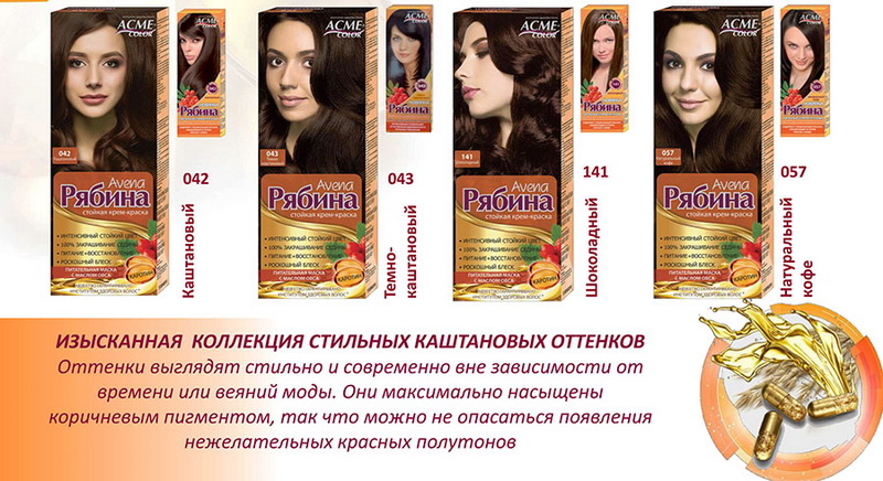 The budget option is a durable cosmetic product. "Rowan". Fine texture means promotes uniform staining. The components that make up, heal the curls. The paint is represented by a palette from sparkling gold, copper tones to very dark shades.
