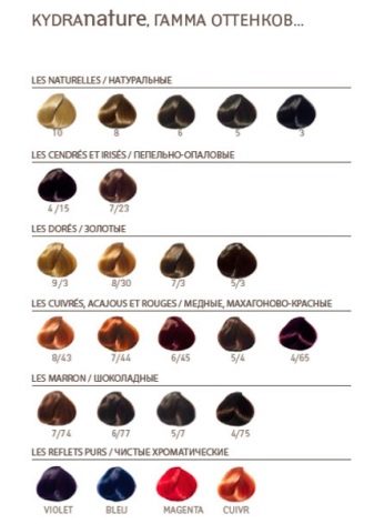 The palette of dyes from Kydra Nature is a wide range of colors, among which it will be difficult not to find the right one. In the extensive palette of creams for professionals there are 24 colors, and in addition, 4 more pure colors.