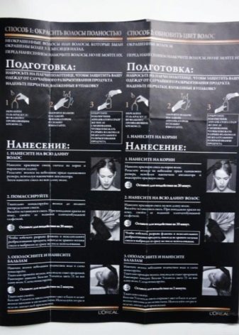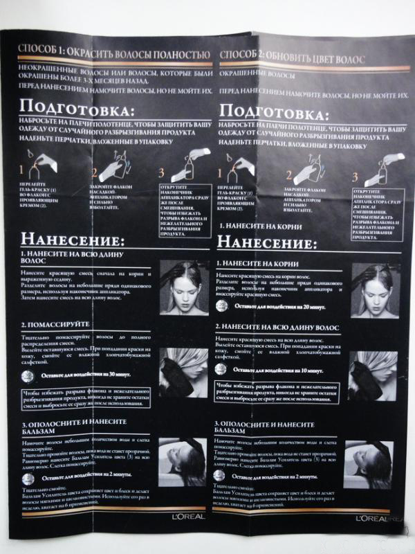 Before you start painting yourself, you should examine the contents of the package. As already mentioned, the dye kit includes a moisturizing balm that can preserve the result for a long time, and a developer cream that provides an oxidation process. The official site has information that it is 6%. This allows you to change the color to 1-2 tones and paint over gray hair with a small distribution. If the color change is more radical, then you should separately buy 9-12% oxidizer. Also in the package there is gel paint, gloves and instructions that should be studied. In addition to describing the process of dyeing, the brochure contains recommendations for the care of curls.
