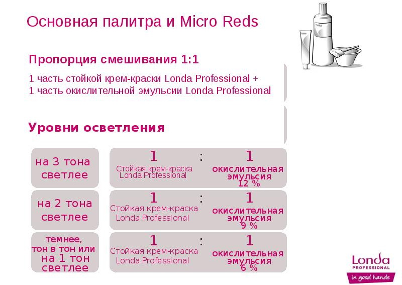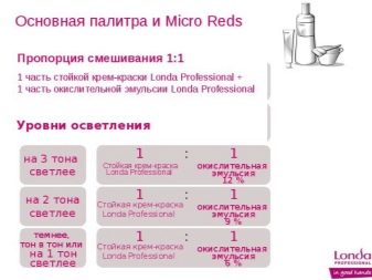 - "Micro Reds". In the standard concentration of the main color palette mixing is carried out in a proportion of 1/1. If you want to get a shade one tone darker or lighter, apply oxide in a concentration of 6%. For dual tone clarification or darkening, an agent with a 9% oxidizer is required. Change the original color to three tones will help 12% oxide.