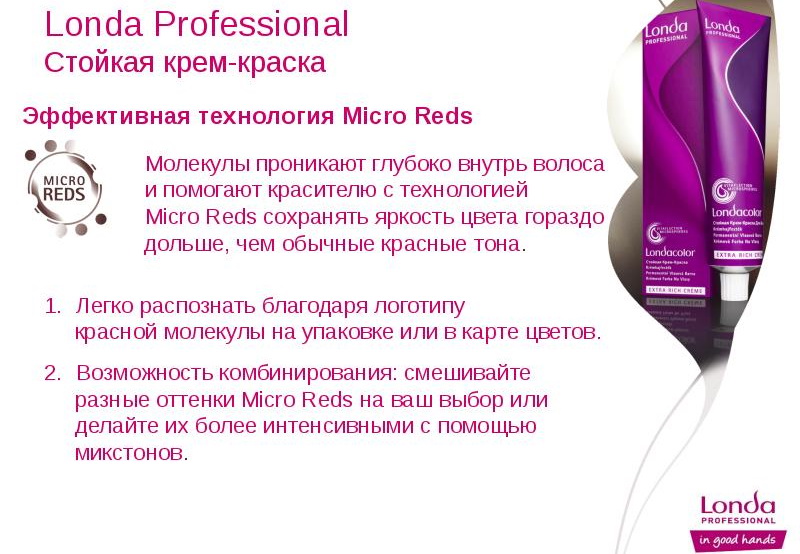 In the composition of the last generation Londa paints you can find natural nourishing waxes and lipids that prevent overdrying of the strands. All toning compositions are based on ammonia free. Vitaflection microscopic pigments provide maximum staining of the hair shaft. Deep penetration into the keratin structure allows dyes to remain inside for a long time, avoiding leaching.