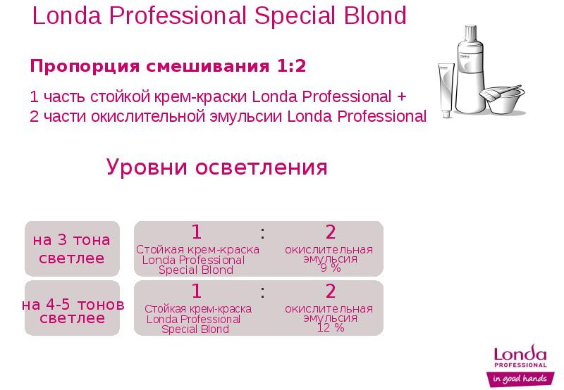 - "Special Blonds" - this range of shades initially assumes the use of proportions 1/2. To clarify for three tones will need to use oxide at a concentration of 9%. To achieve a similar result with five tones, a 12% oxidizer is required for color change.