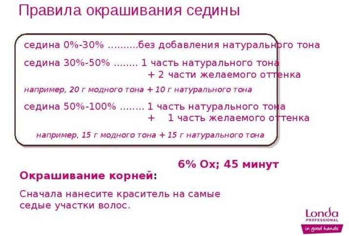 - Gray hair uses a combination of natural and fashionable shades. When the concentration of gray hair over 70% of the natural shade is used in the amount of 50% of all paint used. In the range of 50-70% of gray hair, you need to add a third of a bottle of dye natural range. With a volume of gray hair less than half of the total weight of the strands, you can use the standard paint concentration of any fashionable shade.