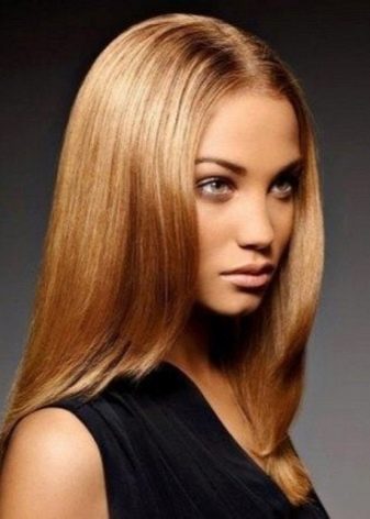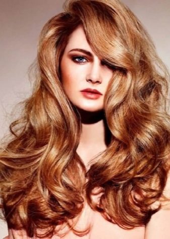 This color of curls, like the shade of a stone, is a rather broad concept. It is characterized by a yellowish-pearlescent play with light caramel notes. It is easiest to create such a color on light and light brown strands; it sets off dark eyes especially well.