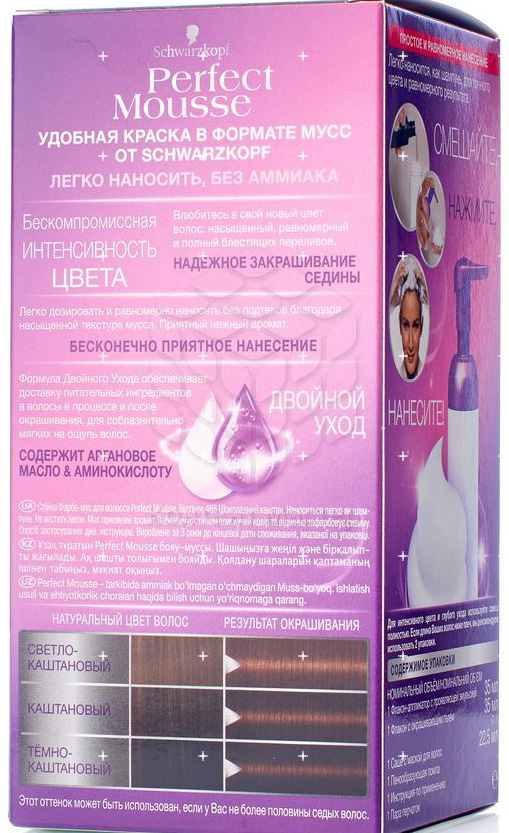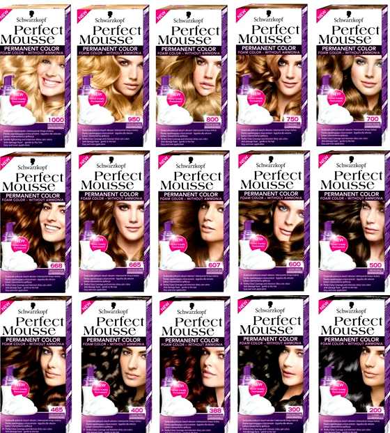 In the color palette there are 17 stylish shades and 3 brighteners, allowing you to get a different blonde. After using this dye on the hair remains a delightful orchid fragrance. Incredible shine, comfortable feeling when coloring, beautiful and healthy look of hair, natural and fashionable colors - and this is all innovative paint foam “Perfect Mousse”.