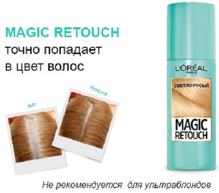 - Blonde. It is also suitable for extremely fair ladies, it is useless on dark hair. When using this tool, you should pay attention to the fact that it has a barely noticeable greenish tone. If sprayed on dyed hair, it will be immediately visible, so spray it gently.