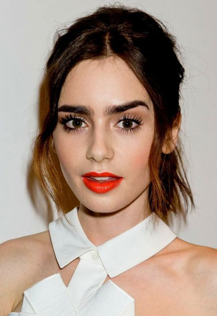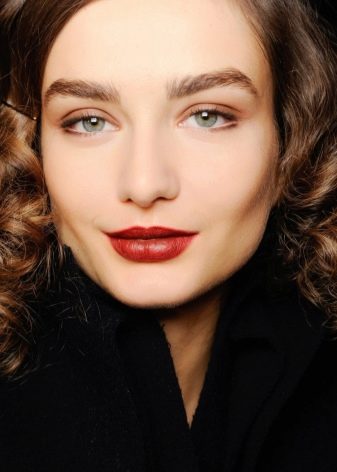 The brown hair color is matched to the shade of the hair - everything is harmonious and complete. The eyes also have a minimum of makeup, only red lipstick makes a second accent on the face with perfectly smooth and clean skin.
