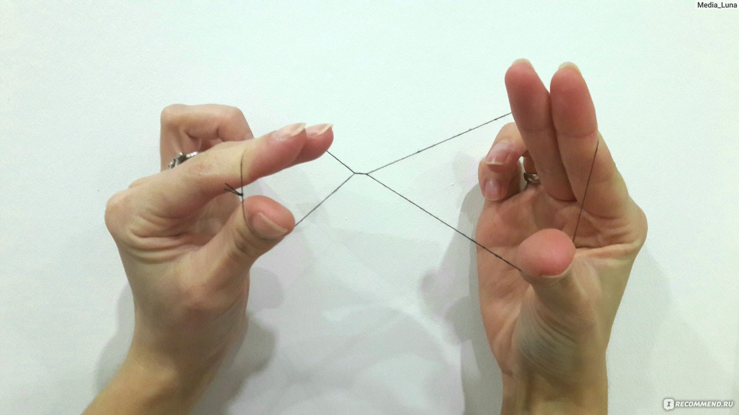 - Take a suitable thread about 50 cm long, tie its ends, stretch the resulting ellipse between the fingers of both hands.