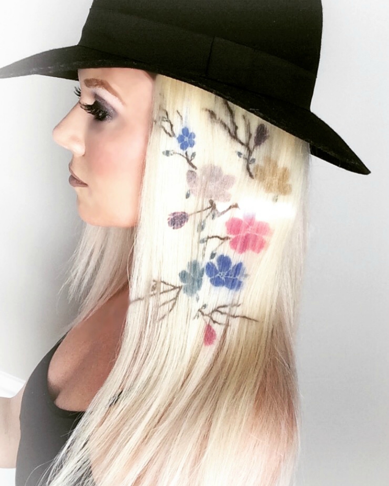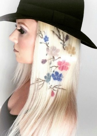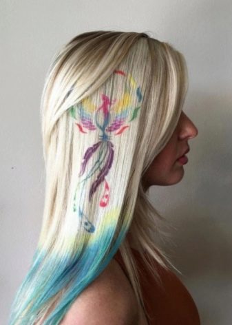 - Stencil Painting is in great demand among the representatives of youth subcultures and scandalous fashionistas. In fact, this is a drawing on the strands of a specific pattern with special paint using a pre-prepared template. This type of dyeing on straight long hair looks perfect, as it is possible not to limit the size and choice of the pattern. The pigment for it can be temporary, due to which you can use the technique to create a creative image for a short period.